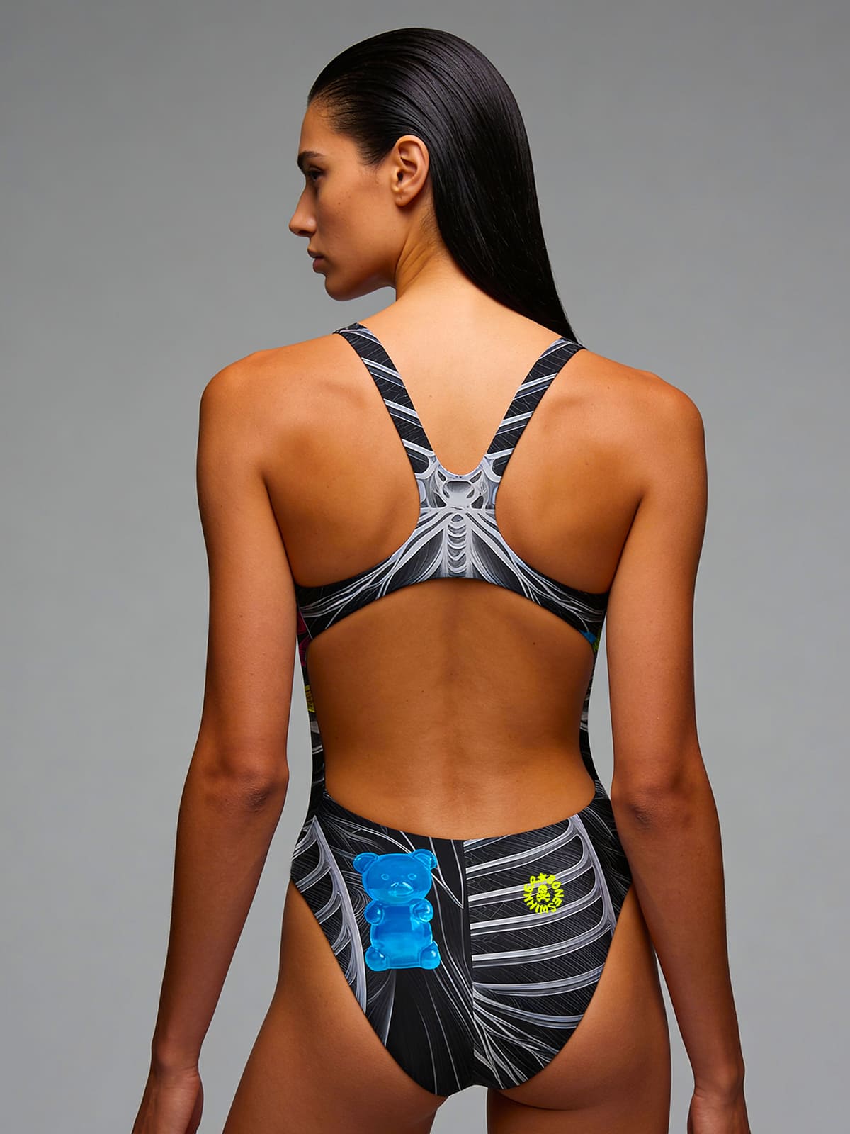 A bold and contemporary visual concept that blends dark aesthetics with pop details. The visual contrast is heightened by colorful sweets breaking the radiographic monochrome. The predominant black lends elegance, mystery, and a strong visual impact, made for swimmers who like to stand out with an alternative style, between dark art, surrealism, and pop culture.