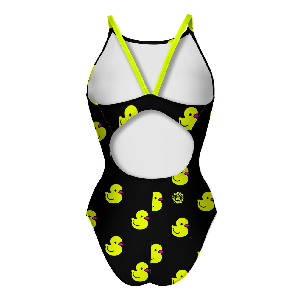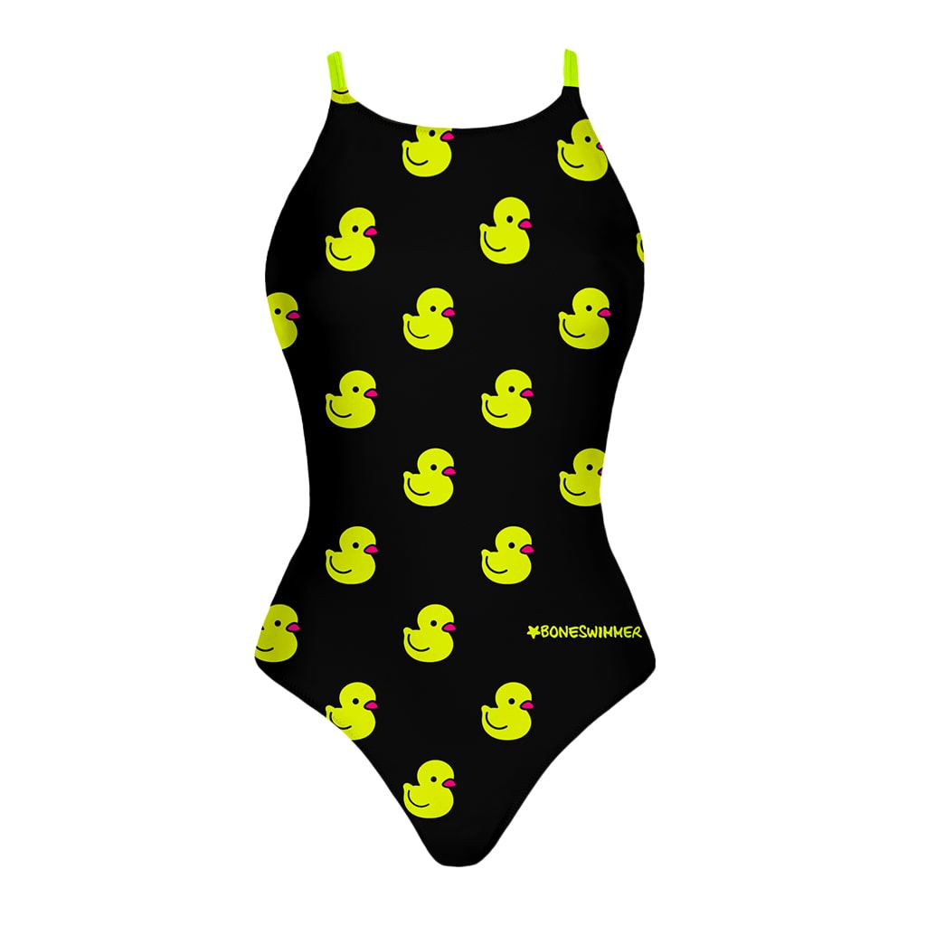 Print: cute fluorescent yellow ducklings scattered on a black background, creating a playful and lively look. Perfect for those who love to bring a bit of cheerfulness and lightness to the pool.