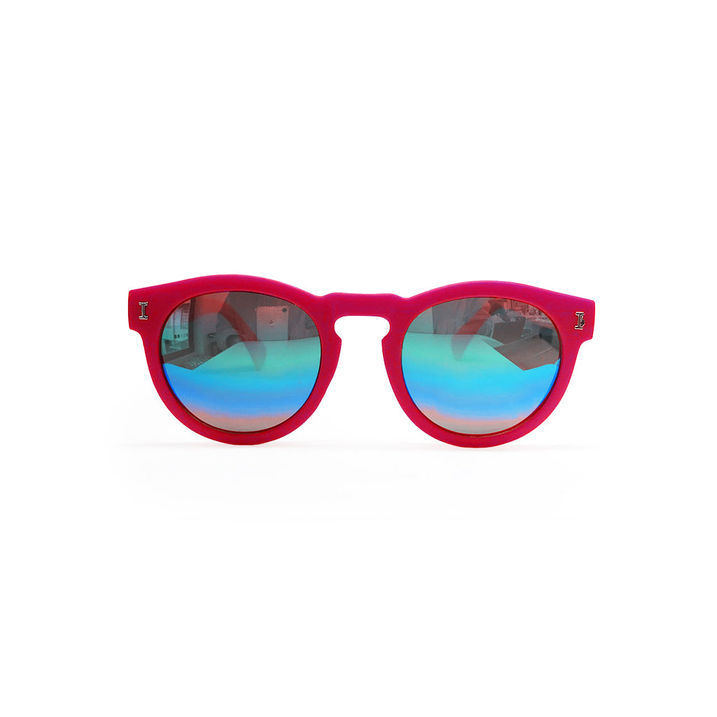 Sunglasses with round blue mirrored lens and UV400 protection. Soft touch finish on the frame.