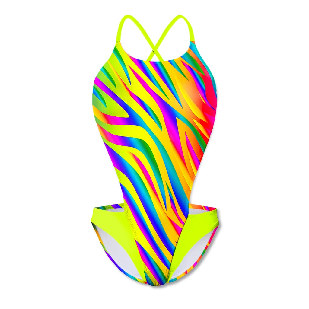 Style: the ROAR model is a bold and vibrant style statement, designed for those who love to express a wild and unconventional personality. The zebra lines, reworked in an explosion of neon and rainbow colours, represent a true challenge to traditional standards, an invitation to break conventions with energy and vitality. Those who wear ROAR do not settle for going unnoticed: they want to be seen, carrying a tribal character and a warrior attitude, but with a touch of playfulness and fun. It is the ideal costume for those who live life with passion, love to feel free, and want to give voice to a strong, creative, and daring personality even in leisure and relaxation.