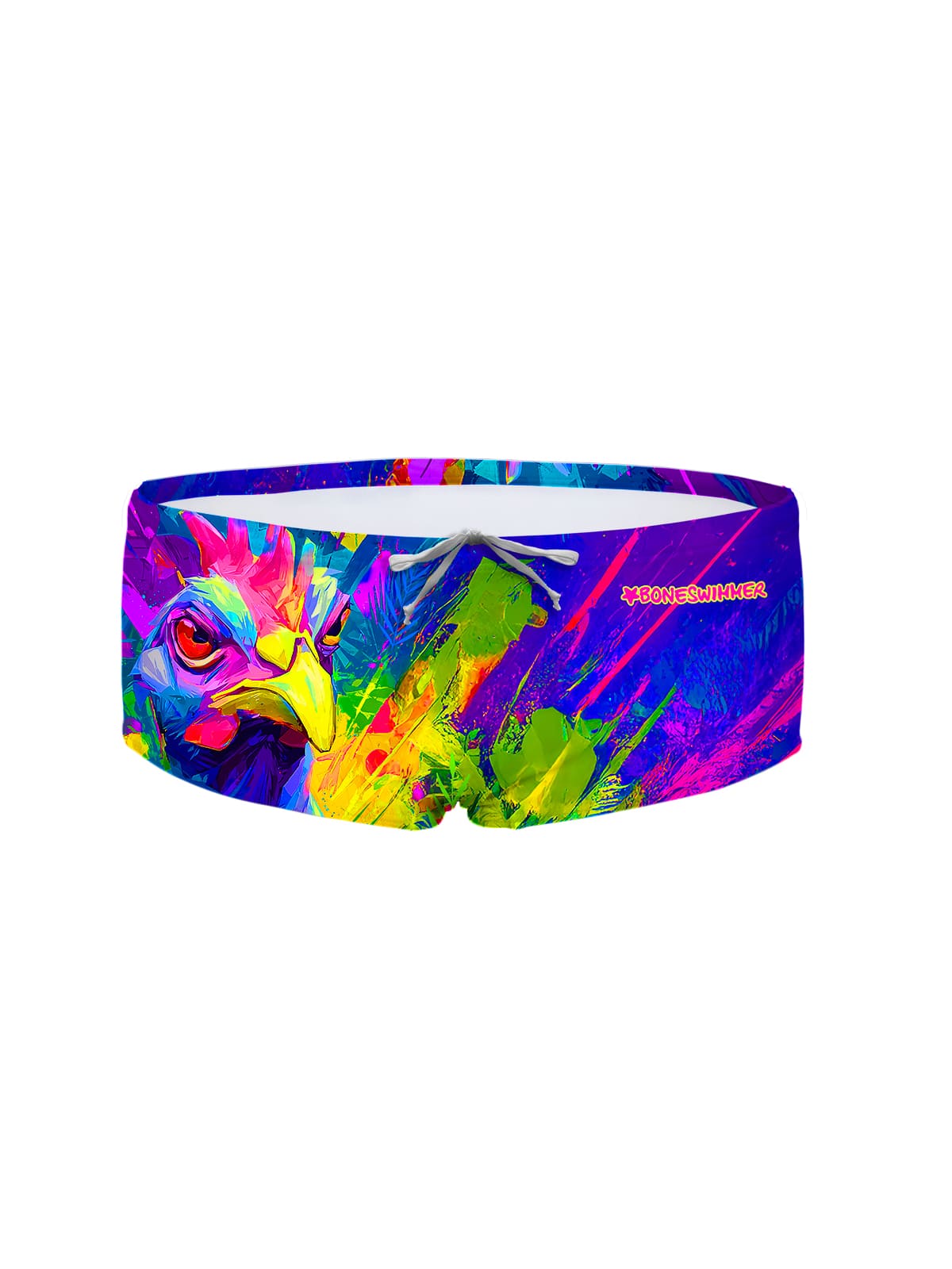 Training boxer swimsuit, Ucla model. "Rooster" print: personality and competitive spirit fueled by the determined gaze of a rooster in vibrant, fluorescent tones.