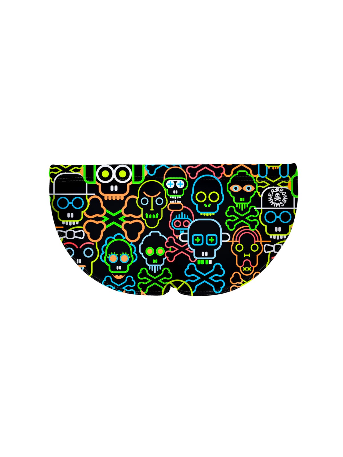 Training brief swimsuit, H2otto model. "Skull tribe" print: tribal pattern, neon skull outlines, vivid fluo colors.