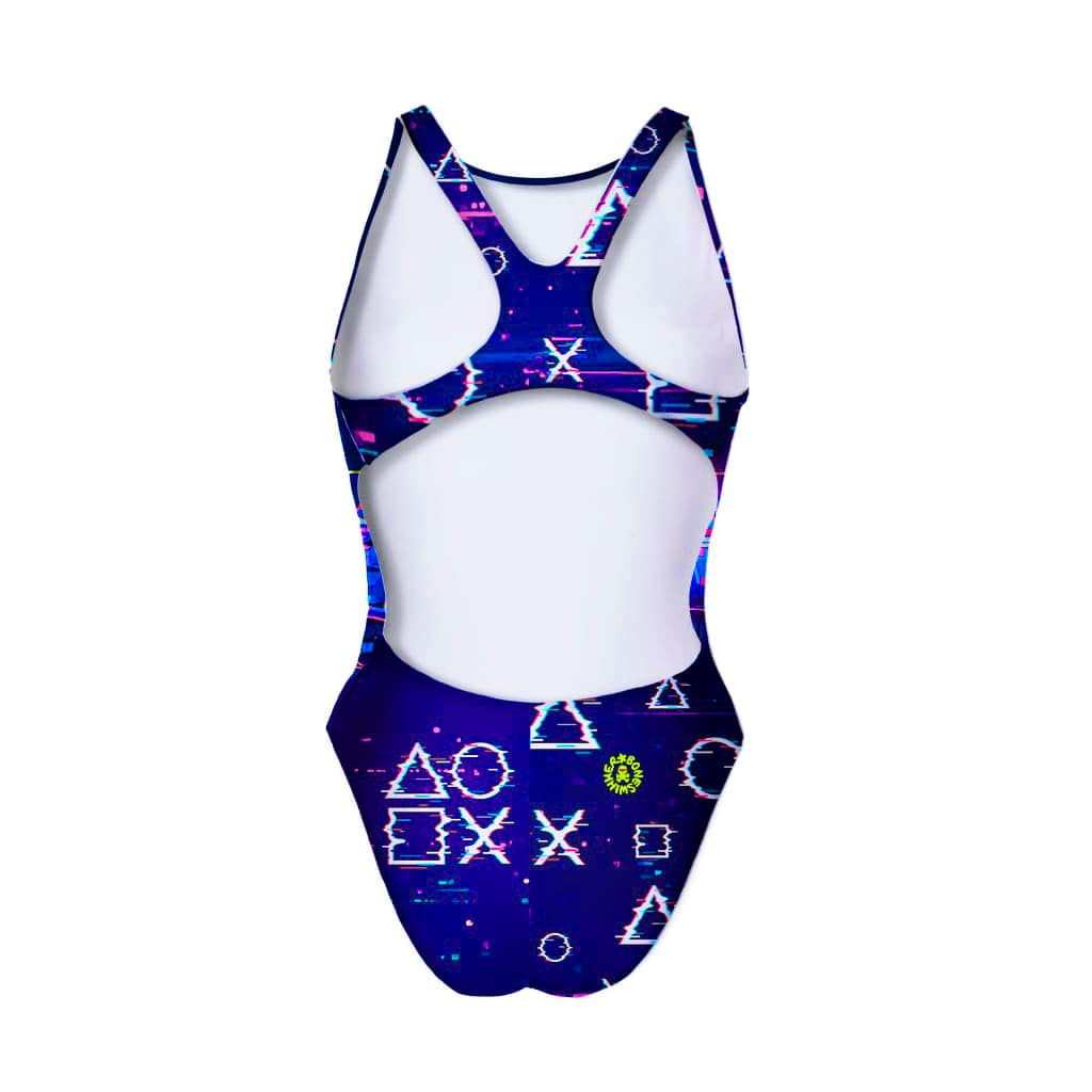 Pinup training one-piece swimsuit. "Gamer" print: a design inspired by the world of video games, for a fun and colorful look in the pool.