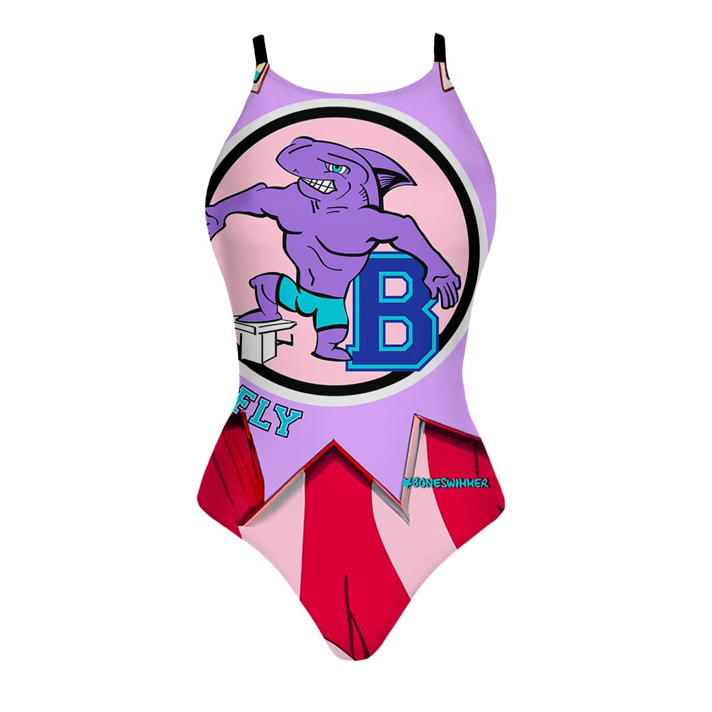 Style: dedicated to dolphin or butterfly stroke swimming, this costume catches the eye with its bold and playful graphic: a "fierce" dolphin in cartoon style, ready to dive off the starting blocks. The bright colours and pop American aesthetic convey energy and determination, reflecting the spirit of those who face the water with grit and fearlessness. Ideal for those seeking a swimming costume that combines sporting function with a charismatic and unconventional mood.