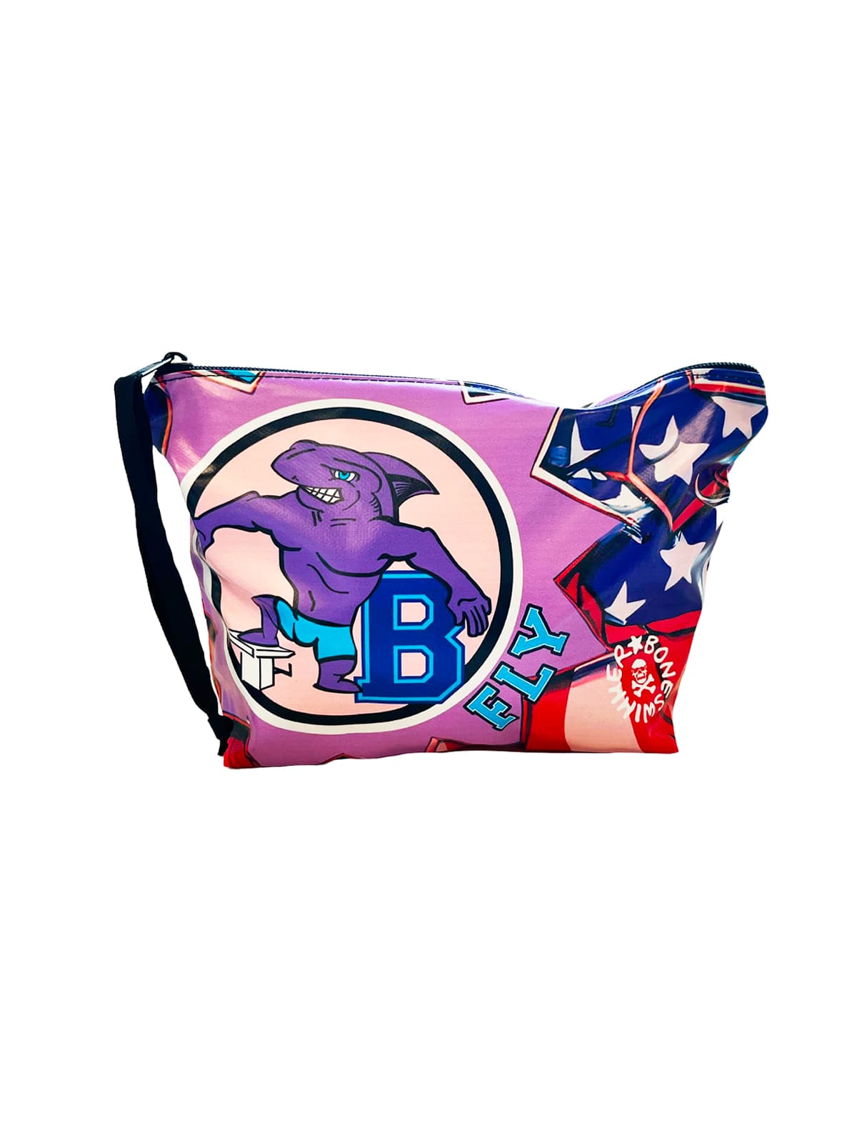 Style: dedicated to dolphin or butterfly swimming, this beauty case from the FLY line catches the eye with its bold and playful graphic inspired by American colleges: a "tough" dolphin in cartoon style, ready to dive off the starting blocks. The bright colors and pop aesthetic convey energy and determination.